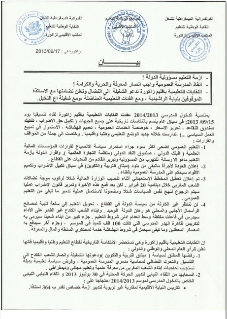 تعليمعام زاكورة: أزمة التعليم تهدد الموسم الدراسي الجديد بواسطة زاكورة في سبتمبر 21, 2013 0 842 شارك 0 842 شارك FacebookTwitterGoogle+ReddItWhatsAppPinterestالبريد الإلكترونيLinkedinTumblr