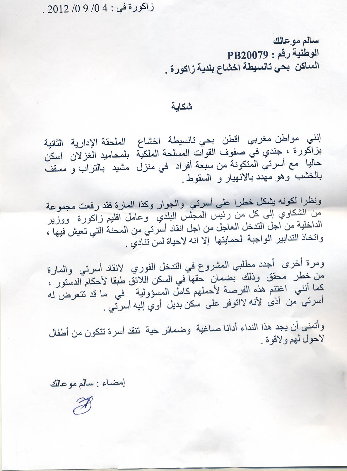 زاكورة (زاكورة بريس) توصل موقع زاكورة بريس بشكاية من السيد سالم موعالك الساكن بحي تانسيطة اخشاع، الملحقة الإدارية الثانية بزاكورة ، جندي في صفوف القوات المسلحة الملكية بلمحاميد الغزلان يسكن حاليا مع أسرته المتكونة من سبعة أفراد في منزل مشيد بالتراب ، مهدد بالانهيار و السقوط .