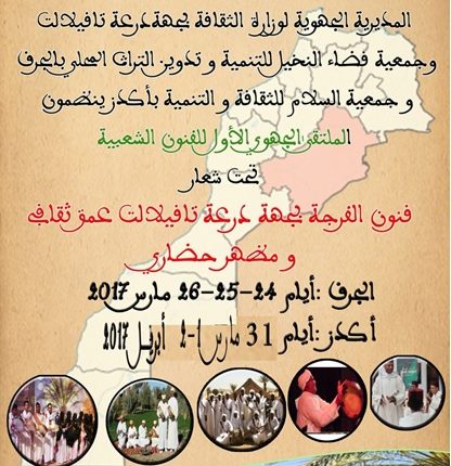 في إطار الأنشطة الثقافية والفنية التي شرعت المديرية الجهوية لوزارة الثقافة بجهة درعة تافيلالت في إنجازها  وفق مقاربة تشاركية مع الهيئات المنتخبة وفعاليات المجتمع المدني ، تنظيم الدورة الأولى للملتقى الجهوي للفنون الشعبية بجهة درعة تافيلالت تحت شعار : ” فنون الفرجة بجهة درعة تافيلالت ، عمق ثقافي ومظهر حضاري ” وذلك بكل من :
