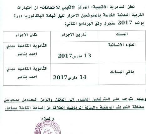 تواريخ اختبارات التربية البدنية للمترشحين الأحرار