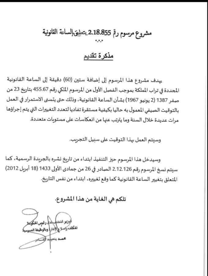 تفاجأ المواطنين صباحا هذا اليوم بقرار مجلس الحكومة المتعلق بمشروع مرسوم رقم 2.18.855 الخاص بالساعة القانونية، و يهدف مشروع هذا المرسوم إلى إضافة ستين دقيقة إلى الساعة القانونية المحددة في تراب المملكة بموجب الفصل الأول من المرسوم الملكي رقم 455.67 بتاريخ 23 من صفر 1387 الموافق 2 يونيو 1967 بشأن الساعة القانونية، وذلك حتى يتسنى الاستمرار في العمل بالتوقيت الصيفي المعمول به حاليا بكيفية مستقرة، تفاديا لتعدد التغيرات التي يتم إجراؤها مرات عديدة خلال السنة و ما يترتب عنها من انعكاسات على مستويات عديدة. و سيدخل هذا المرسوم حيز التنفيذ ابتداء من تاريخ نشره في الجريدة الرسمية ، كما سيتم نسخ المرسوم 2.12.126 الصادر في 26 جمادى الأولى 1433 الموافق 18 ابريل 2012 المتعلق بتغير الساعة القانونية كما وقع تغيره ابتداء من نفس التاريخ.