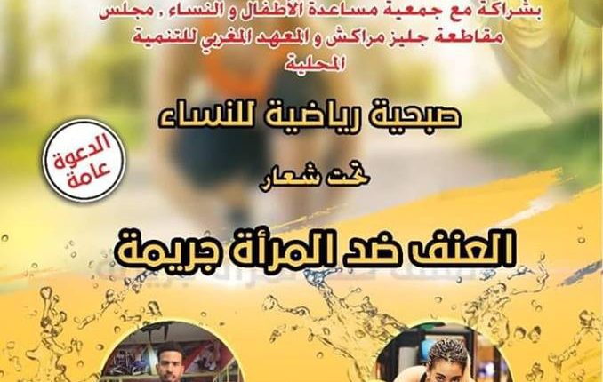 تحت شعار ” العنف ضد المرأة جريمة ” تنظم جمعية باراكا إدمان جهة مراكش آسفي بشراكة مع جمعية مساعدة الأطفال و النساء و مجلس مقاطعة جليز مراكش و المعهد المغربي للتنمية المحلية ” صبحية رياضية للنساء يوم الأحد 25 نونبر 2018 على الساعة الثامنة و النصف صباحا بالقاعة المغطاة مولاي رشيد الداوديات .