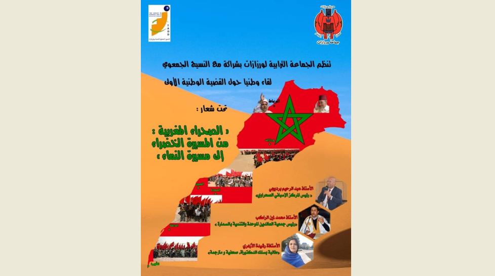 تنظم الجماعة الترابية لورزازات بشراكة مع النسيج الجمعوي لورزازات، لقاء وطنيا حــول قضيـة الصحراء المغربية تحت شعار ” الصحراء المغربية : من المسيرة الخضراء إلى مسيرة النماء”، وذلك يوم 22 دجنبر 2018 بقصر المؤتمرات بمدينة ورزازات.