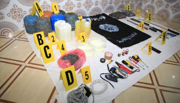 هذا و قد أفاد البلاغ الذي نشرته المديرية، بأن إجراءات التفتيش و المسح المكاني كشفت عن وجود قارورة و قنينات من أحجام مختلفة تضم حمض النيتريك و سوائل كيماوية مشكوك فيها، و كميات من المسامير و الأسلاك الكهربائية، و 6 قنينات غاز من الحجم الصغير، يُشتبه في تسخيرها لأغراض إعداد متفجرات تقليدية الصنع. كما تم أيضا حجز “علم “كبير يحمل شعار تنظيم داعش، ملابس شبه عسكرية، و أسلحة بيضاء من أحجام مختلفة من بينها قاطعات حادة و أدوات راضة و سيف من الحجم الكبير، معدات ودعامات معلوماتية، فضلا عن مطبوعات و صور لعدنان “أبو الوليد الصحراوي” القيادي السابق في تنظيم داعش بمنطقة الساحل و الصحراء.