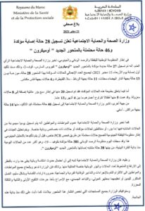 و تخبر وزارة الصحة والحماية الاجتماعية عموم المواطنات والمواطنين وفق ذات البلاغ، أنه يتم تسجيل يوميا مجموعة من الحالات المشتبه فيها إما بؤر، أو مخالطين لحالات مؤكدة، أو حالات ذات خصائص وبائية خاصة. ويتم تحليل العينات في إطار منظومة اليقظة الجينومية لتصبح حالات محتملة عن طريق فحص PCR خاص، قبل أن يتم تأكيدها بالتحليل الجينومي.