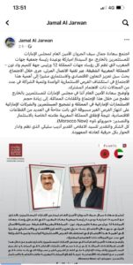 حيث أكد سيف الجروان في تدوينة له على صفحته الرسمية بالفايسبوك أنه تم خلال الاجتماع، بحث سبل تعزيز التعاون الاقتصادي و الاستثماري مشيرًا إلى أهمية هذا الاجتماع في استكشاف الفرص الاستثمارية الواعدة و تنمية الشراكة في عدد من المجالات ذات الاهتمام المشترك.
