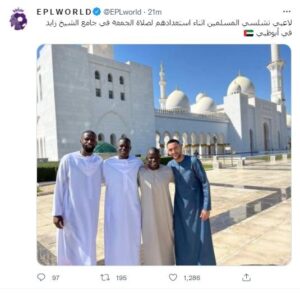 حيث نشر الحساب الرسمي للدوري الإنجليزي الممتاز لكرة القدم باللغة العربية صوراً للنجوم المسلمين بنادي تشيلسي من أمام مسجد الشيخ زايد في أبوظبي بعدما أدوا فيه اليوم، صلاة الجمعة.