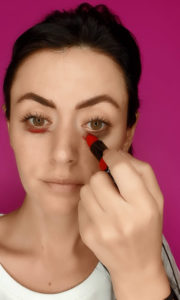 ضعي أحمر شفاه أحمر مكان الهالات السوداء، مديها على كامل المنطقة بواسطة بيوتي بلاندر و بعدها غطي المنطقة بالكونسيلر باش تخفي أثار الإحمرار.