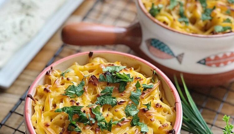 غراتان المعكرونة و النقانق بصلصة البشاميل