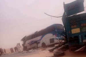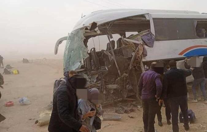 بالصور..الطريق الوطنية بين العيون و طرفاية بمنطقة جماعة الداورة تشهد حادثة سير خطيرة نتج عنها قتلى و جرحى في إصطدام حافلة و شاحنة