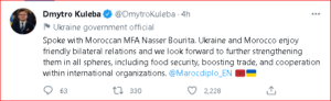 حيث أكد وزير الخارجية الأوكراني، في تغريدة له على حسابه الشخصي بـ “تويتر”، أن أوكرانيا و المغرب يتمتعان بعلاقات ثنائية ودية، و أنهما يتطلعان إلى تعزيز تعاونهما في جميع المجالات، بما في ذلك الأمن الغذائي و تعزيز التجارة و التعاون داخل المنظمات الدولية.