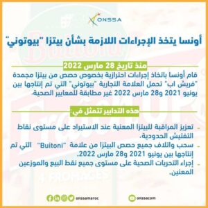 حيث أكد مسؤولوا “أونسا” في منشور نشره على صفحته الرئيسية بـ”الفايسبوك”، على أنه قام بإتخاذ إجراءات إحترازية بخصوص حصص من بيتزا مجمدة فريش آب تحمل العلامة التجارية “بيوتوني”، التي تم إنتاجها بين يونيو 2021 و 28 من مارس المنصرم، غير مطابقة للمعايير الصحية.