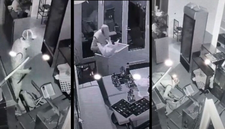 حيث أن المشبه فيه الذي كان يستعين بكمامة لاخفاء ملامحه امام الكاميرات، و هو يسرق محتويات حقائب تم تركها في المحل، قبل ان يشرع في محاولة تكسير دُرج يرجح انه خاص بصندوق الاداء.