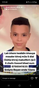 وتقاسمت دعاء اليحياوي صورة شقيقها الصغير ريان عبر خاصية “الستوري” أرفقتها بتدوينة جاء فيها :” الله يرحم الوالدين خويا موضر خرج مع الخمسة ديال العشية ما بقاش رجع سميتو ريان وفعمرو 13 سنة.