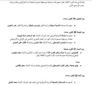 ويكمل هذه المجالس الموسيقية برنامج متنوع يصلها بعروض الندوة العلمية الكبرى التي تقام بخزانة ابن يوسف العتيقة، و تقام الندوة في نسختها الثانية حول حاضر” ومستقبل المدن العتيقة “، وتحاول الإجابة عن مسألة تثمين تراث هذه المدن، من خلال ثلاثة محاور وهي كالآتي :