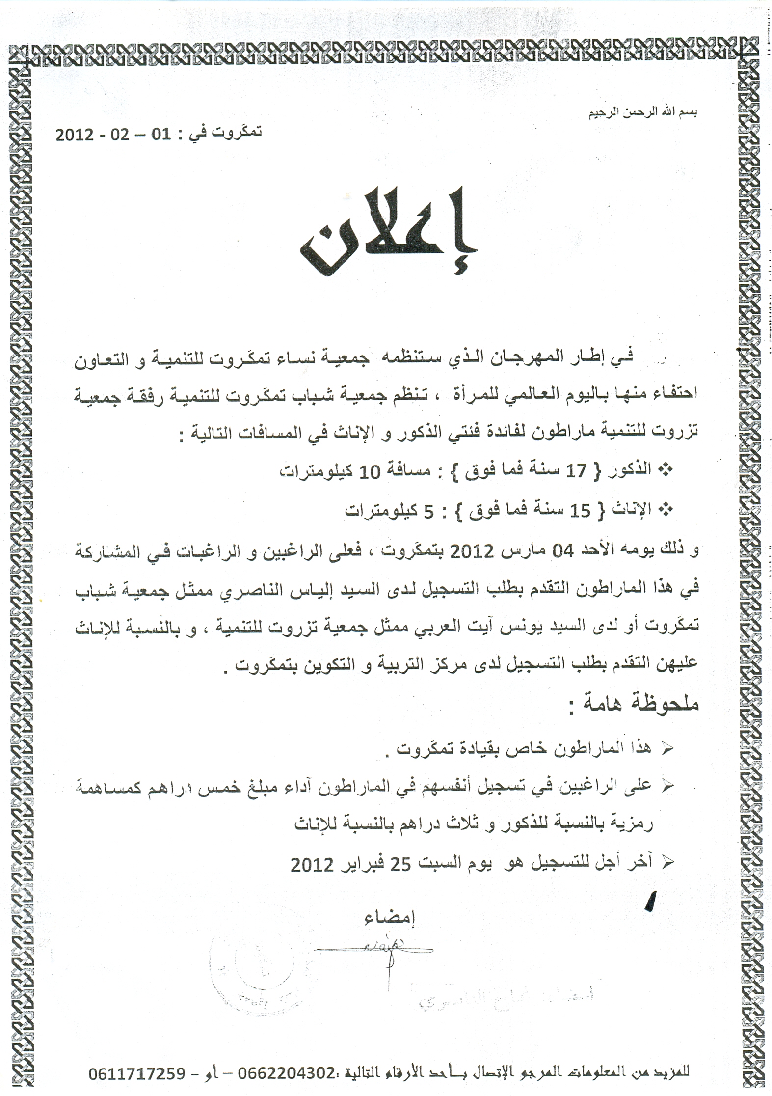 والتي تعتبر ركيزة اساسية لنجاح كل عمل منظم من قبل الجمعيات المحلية فهذا المهرجان الذي تنظمه جمعية نساء تمكروت بشراكة مع عدة مؤسسات اصبح تقليدا سنويا في تمكروت فكونوا في الموعد ابتداءا من يوم 05 مارس 2012