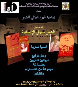نظمت مندوبية وزارة الثقافة بورزازات وزاكورة٬ و”صالون أصدقاء الإبداع” التابع لجمعية فضاء الأسرة والطفولة بورزازات مؤخرا أمسية شعرية٬ وذلك بمناسبة بالاحتفاء باليوم العالمي للشعر.