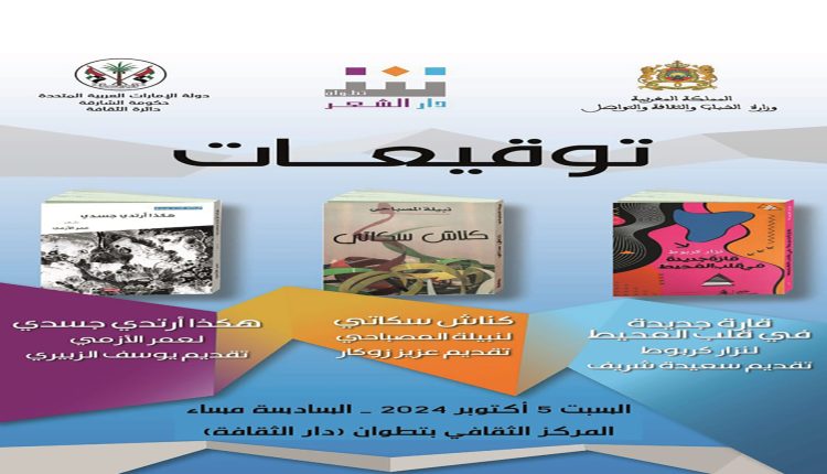 ويشهد اللقاء توقيع ديوان “قارة جديدة في قلب المحيط “للشاعر نزار كربوط، تقدمه الكاتبة والإعلامية سعيدة شريف، والديوان الزجلي “كناش سكاتي” للشاعرة الزجالة نبيلة المصباحي، ويقدمه الكاتب والزجال عزيز زوكار، وديوان “هكذا أرتدي جسدي” للشاعر عمر الأزمي، ويقدمه الكاتب والناقد يوسف الزبيري. بينما يجري اختتام التظاهرة بتنظيم أمسية شعرية يساهم فيها الشعراء المشاركون في هذه التظاهرة.