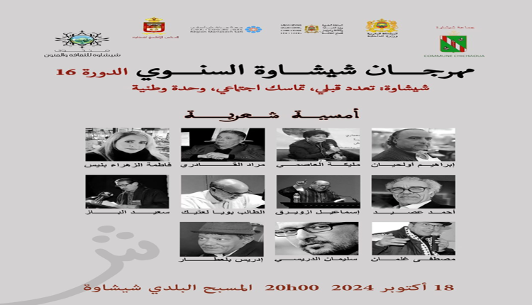 ينظم المجلس الجماعي لمدينة شيشاوة، بشراكة مع المجلس الإقليمي لشيشاوة ومجلس جهة مراكش آسفي، ووزارة الشباب والثقافة والتواصل، ومنتدى شيشاوة للثقافة والفنون، الدورة 16 من مهرجان منتدى شيشاوة للثقافة والفنون، ما بين 16 أكتوبر و 20 منه 2024 تحت شعار “شيشاوة. تعدد قبلي، تماسك اجتماعي ووحدة وطنية”.