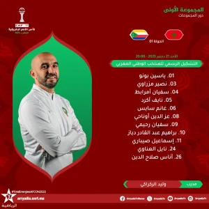 كشف الناخب الوطني وليد الركراكي التشكيلة الرسمية للاعبي المنتخب المغربي التي قرر الإعتماد عليها في المباراة التي تجري أطوارها في هذه الأثناء أمام جزر القمر، الأحد 21 دجنبر 2025، برسم إفتتاح نهائيات كأس أمم إفريقيا “كان المغرب 2025”.