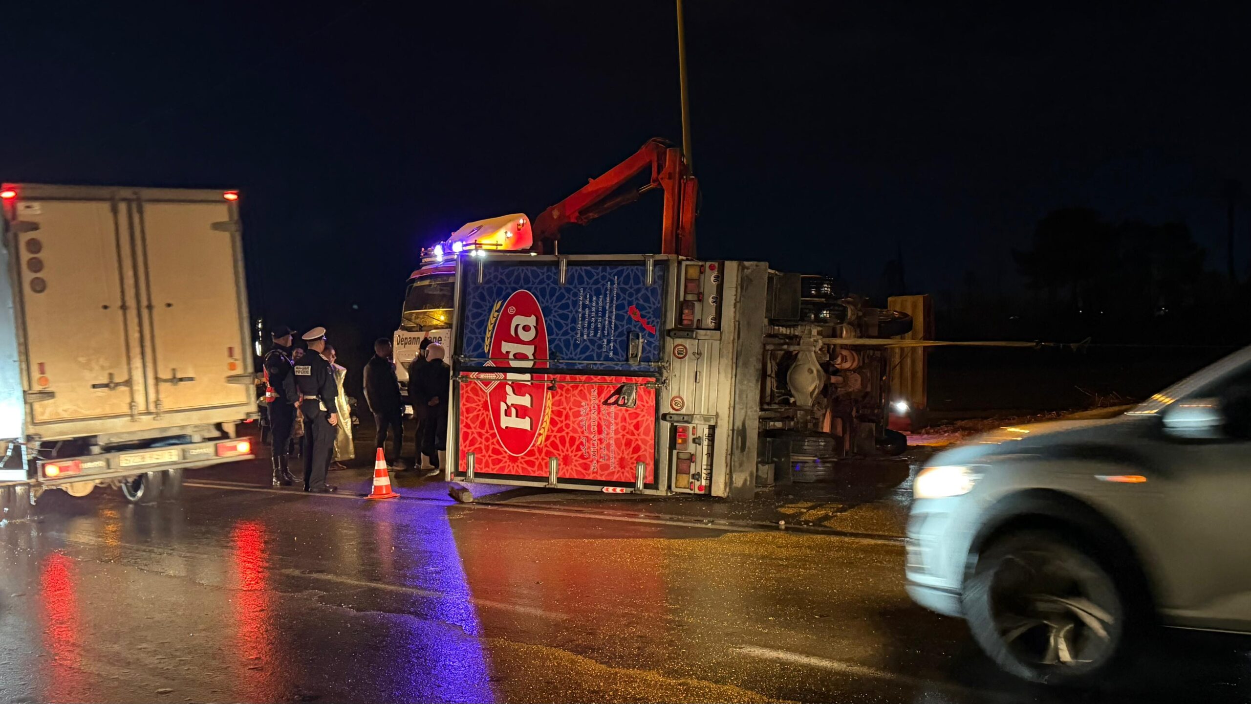 شهدت الطريق المدارية “لاروكاد” الرابطة بين طريق الدار البيضاء ومنطقة العزوزية بمراكش، قبل قليل من ليلة الثلاثاء 24 مارس 2026، حادثة سير تمثلت في انقلاب شاحنة من الحجم المتوسط وسط الطريق.