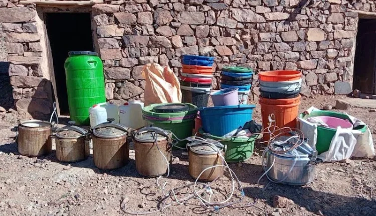 وقد أسفرت العملية عن حجز حوالي 150 كيلوغراماً من التين المخمر المعد للتقطير، بالإضافة إلى 15 لترًا من المسكر الجاهز للتوزيع، فضلاً عن مصادرة الأدوات والأواني المستخدمة في عملية التصنيع التقليدية.