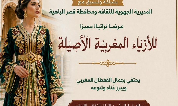 تنظم جمعية أجيال السلام للتنمية والثقافة، بشراكة وتنسيق مع المديرية الجهوية للثقافة ومحافظة قصر الباهية، عرضًا تراثيًا للأزياء المغربية الأصيلة، يحتفي بالقفطان المغربي ويبرز تنوعه وغناه، وذلك يوم 26 أبريل ابتداءً من الساعة السادسة والنصف مساءً، بفضاء القصر بمدينة مراكش، في سياق تثمين التراث الثقافي اللامادي وصون الهوية الوطنية.